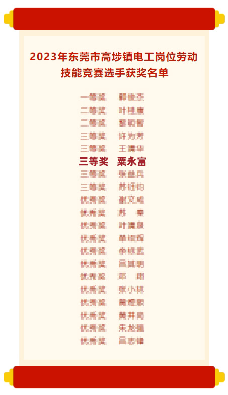 “高埗镇电工技能竞赛三等奖”