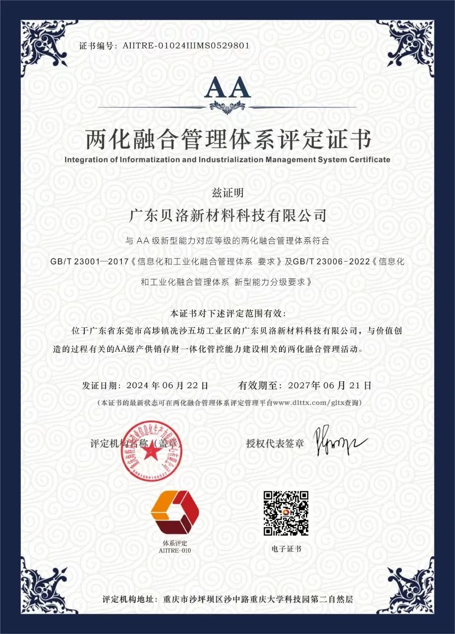 贝洛新材顺利通过“两化融合”管理体系AA级认证及知识产权管理体系认证