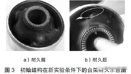 为验证新设计的有效性,团队在实验室MTS多通道试验台架上进行了耐久疲劳试验。结果显示,新结构衬套在V2方向交变60万次、V1方向交变13万次后,均未出现裂纹,证明了其疲劳耐久性能的显著提升。