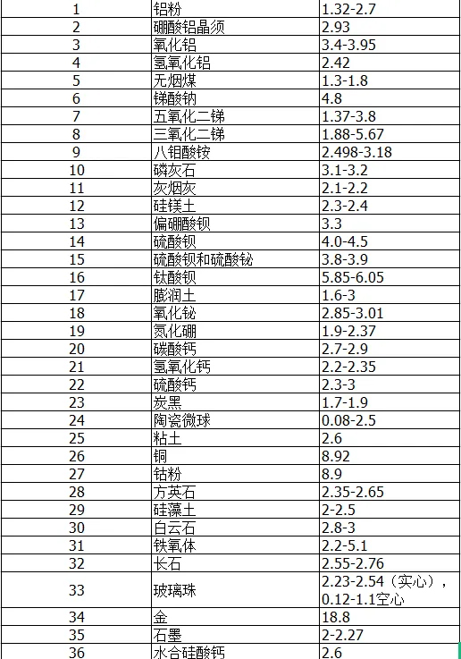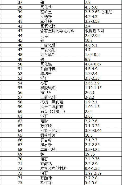 橡胶常用助剂比重表2