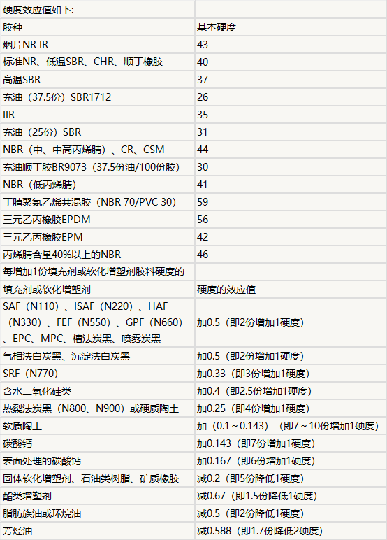 硬度估算值 = 橡胶基础硬度 + 填料(或软化油)用量 × 硬度效应值(填料或软化剂)