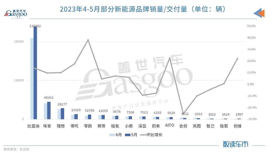 乘联会公布的数据显示,5月新能源车厂商批发渗透率为33.7%,较去年同期26.5%的渗透率提升了7.2个百分点。其中,自主品牌的新能源车渗透率高达50.4%,主流合资品牌的新能源车渗透率仅有4.3%。
