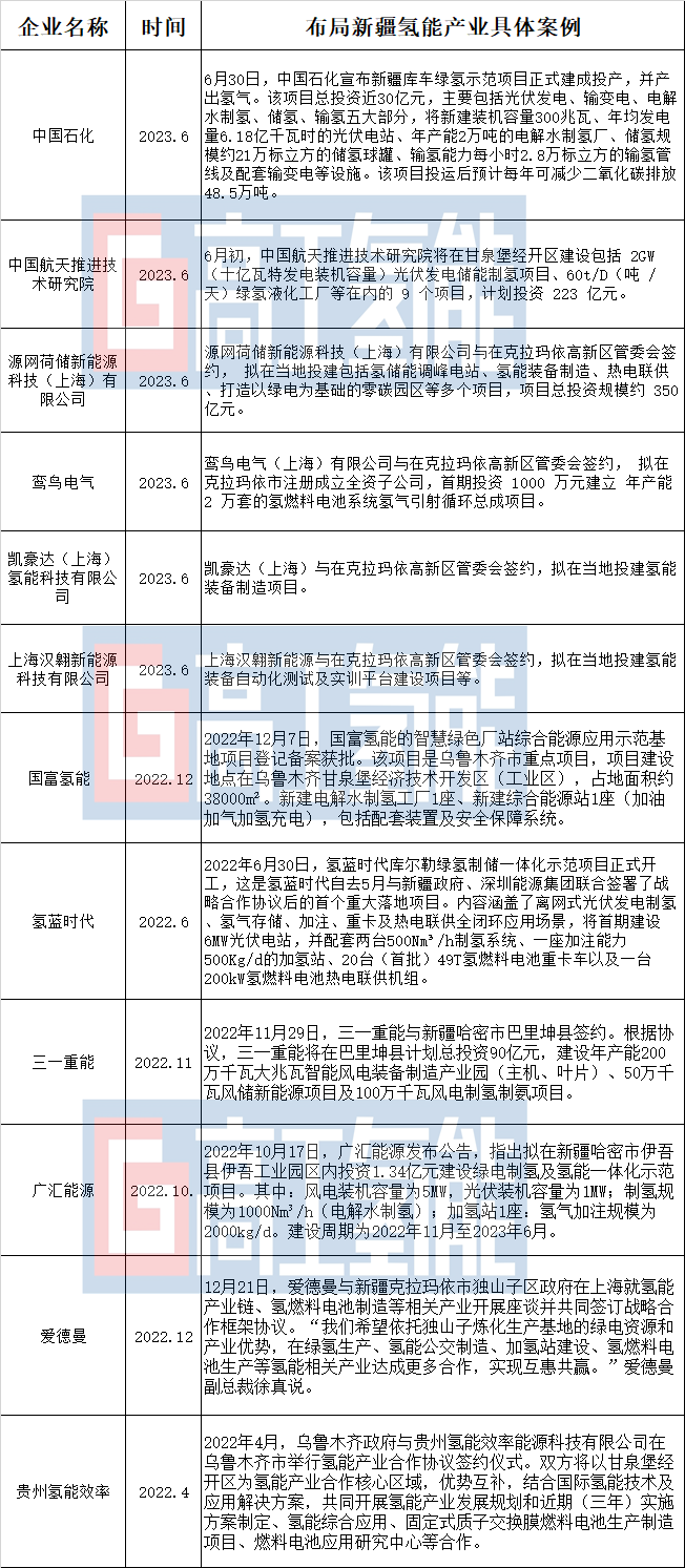 据不完全统计,国内已有中石化、国富氢能、氢蓝时代、三一重工、广汇能源、爱德曼、中国航天推进技术研究院、源网荷储新能源科技等多家公司在新疆展开氢能产业布局,具体布局情况如下: